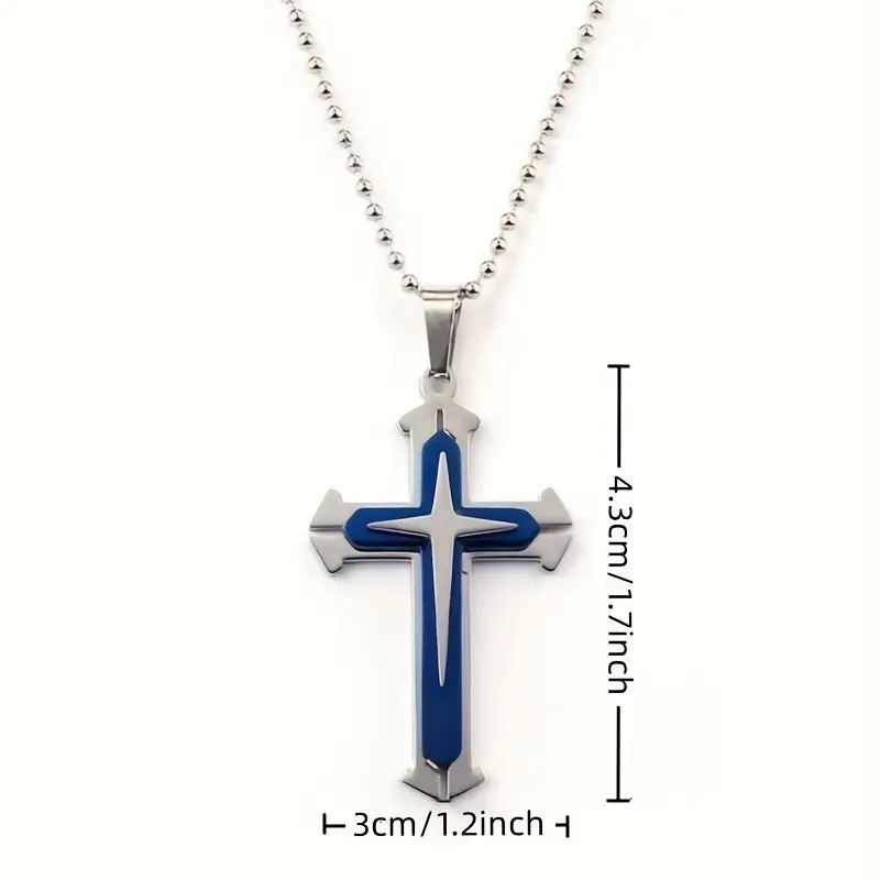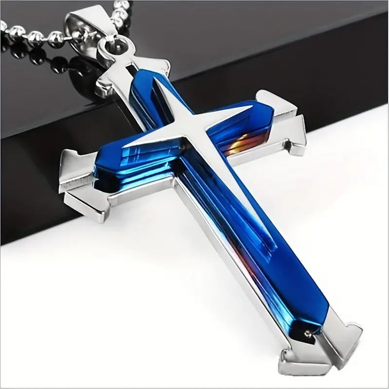 Le immagini mostrano il pendente a croce nei colori blu, oro e nero, offrendo una varietà di scelte per adattarsi a diversi gusti personali. Ogni colore mantiene la stessa qualità di realizzazione e placcatura in oro 18 carati, garantendo un aspetto raffinato e duraturo.