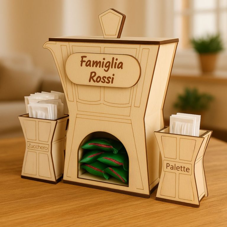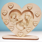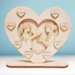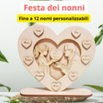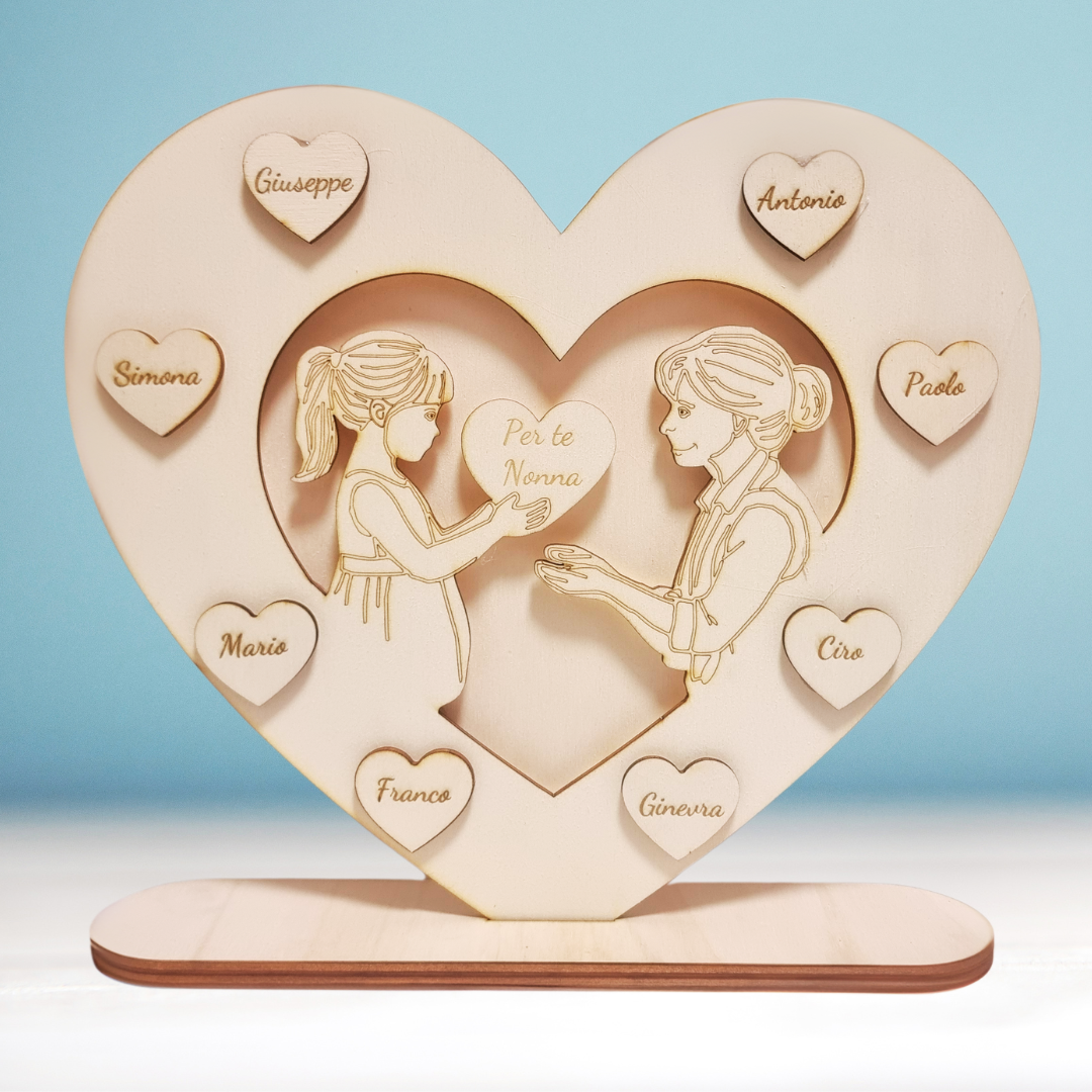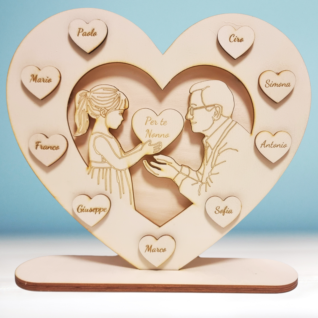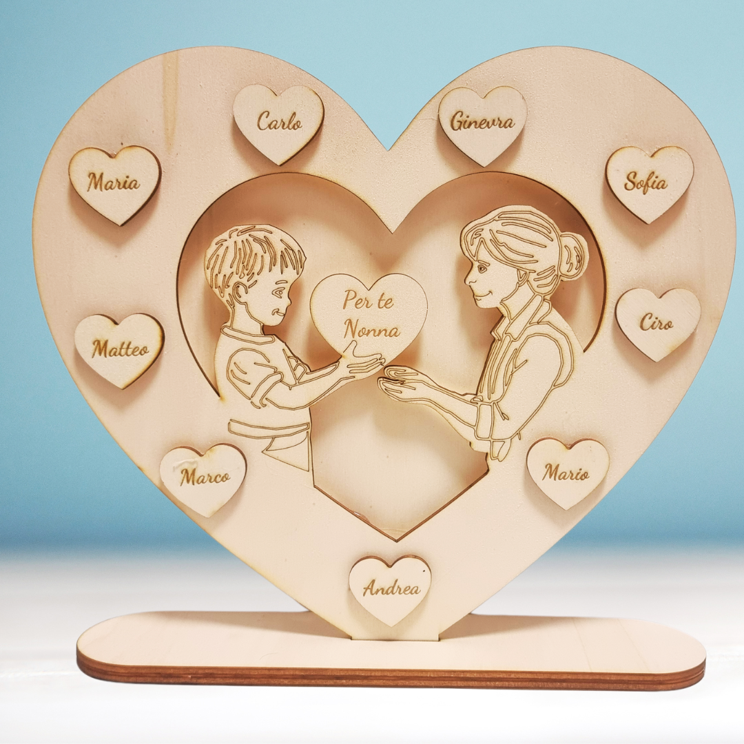 Ogni cuore può essere personalizzato con i nomi dei nipoti, rendendo questo regalo non solo un gesto affettuoso, ma anche un pezzo decorativo per la casa. Le incisioni precise e l’estetica rustica del legno creano un effetto caldo e accogliente, perfetto per ricordare il legame speciale tra nonni e nipoti.