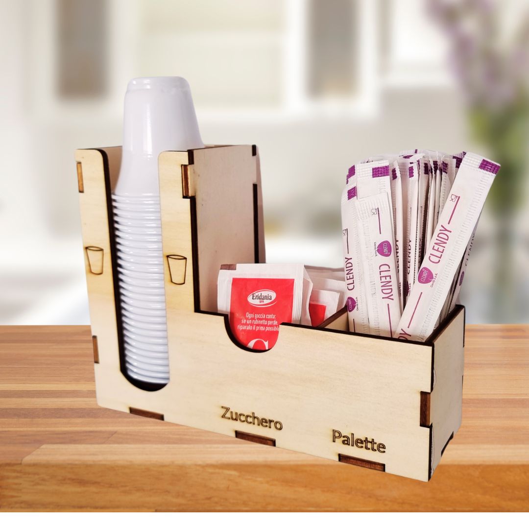 Questo è un pratico organizer in legno progettato per contenere bicchierini, bustine di zucchero e palette, ideale per angoli caffè o zone break in ufficio, negozi o casa.