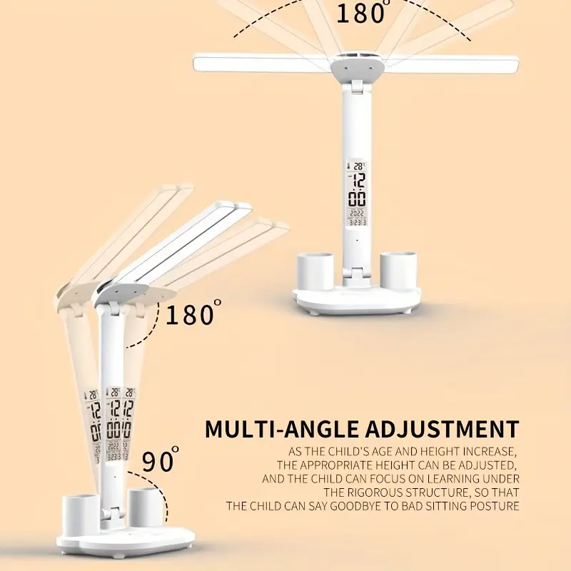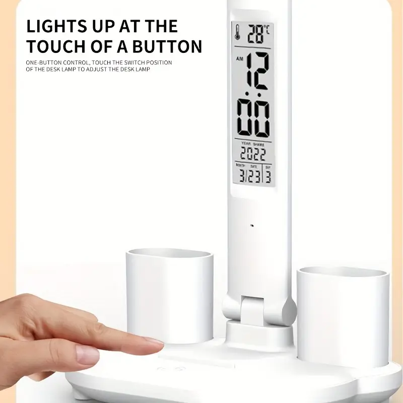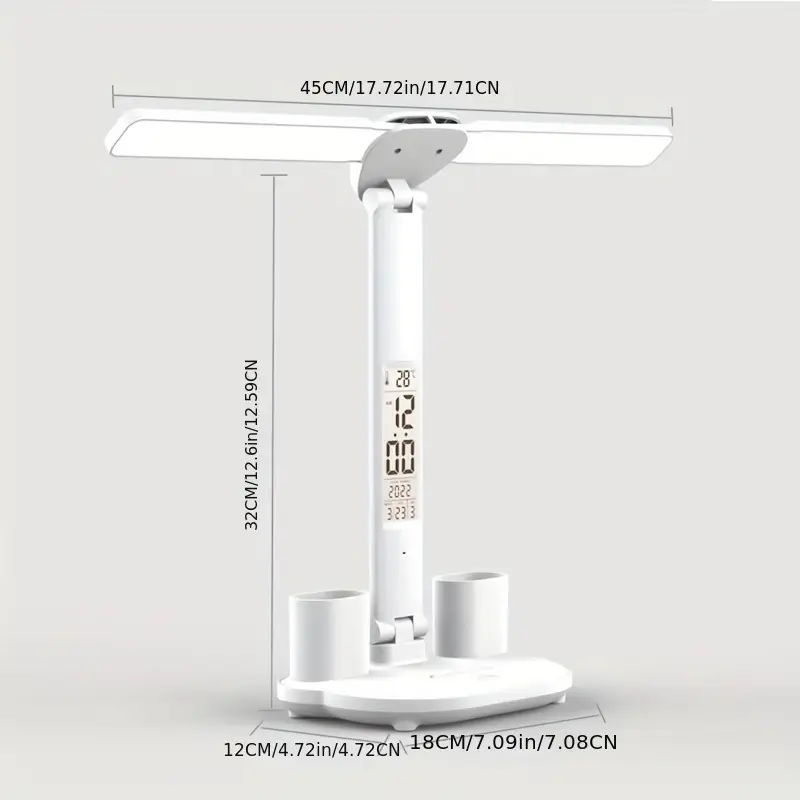 Dona un tocco di modernità e funzionalità al tuo spazio di lavoro o di studio con questa lampada da scrivania a LED. Il design lineare e regolabile è pensato per adattarsi a diverse esigenze di illuminazione e di spazio, mentre il pratico orologio digitale integrato ti consente di tenere sempre sotto controllo ora, data e temperatura.