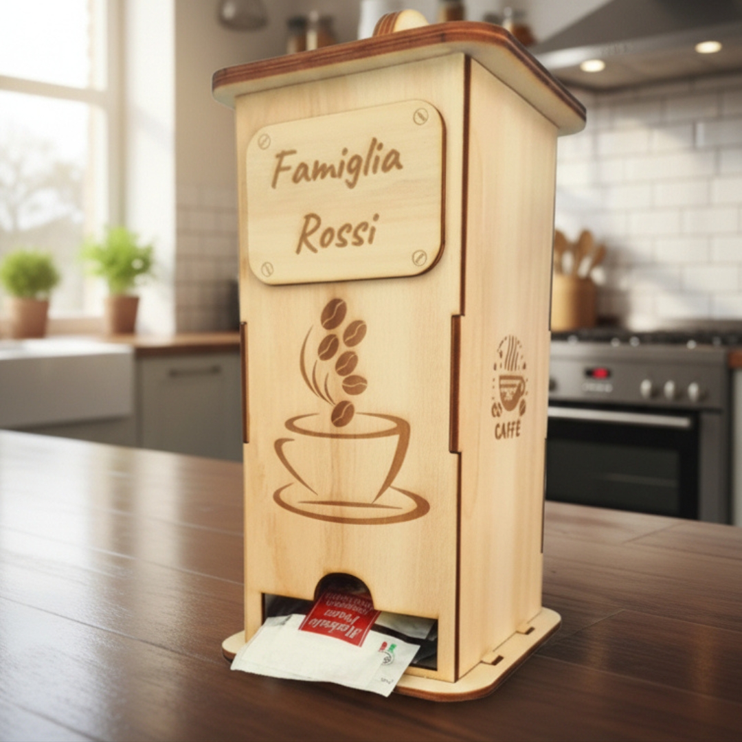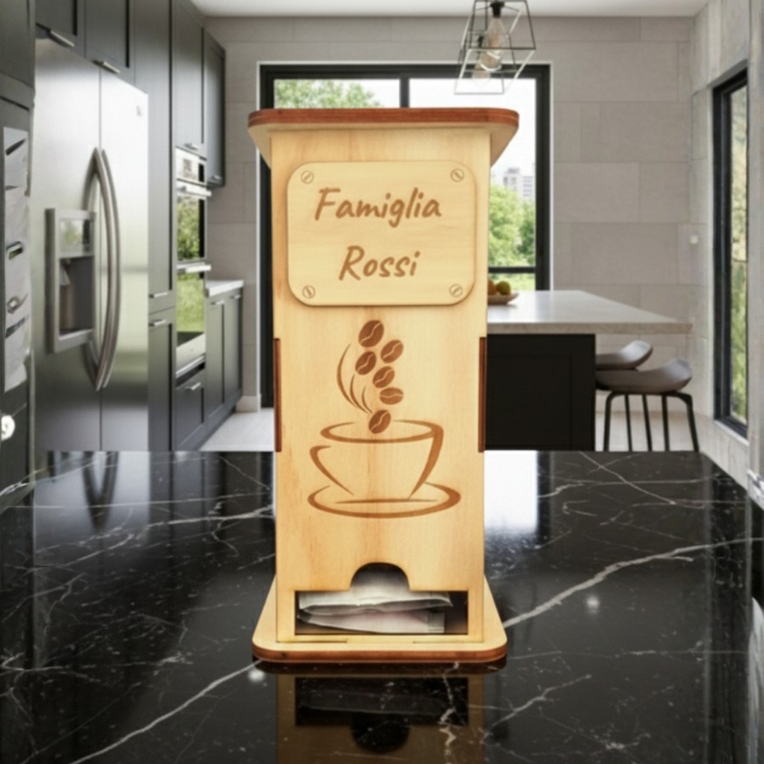 Trasforma il tuo angolo caffè in uno spazio ordinato, accogliente e curato nei minimi dettagli. Questo porta cialde e capsule caffè personalizzato è pensato per chi ama il caffè ma non rinuncia allo stile, unendo funzionalità e design in un unico complemento d’arredo.